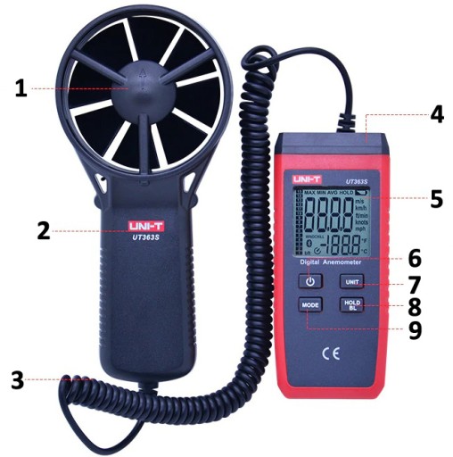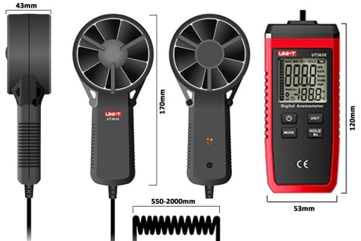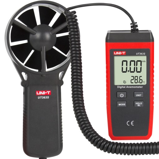 Miernik do pomiaru temperatury i prędkości przepływu powietrza (anemometr). Posiada sondę wiatraczkową o średnicy 70mm z przewodem spiralnym rozciągającym się od 50cm do 2 metrów.