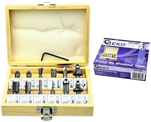 Zestaw 12 frezów kształtowych do drewna pozwalające na precyzyjną obróbkę materiału.