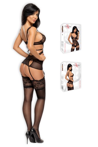 Zmysłowy komplet bielizny wykonany z koronki oraz tiulu. Górna część delikatnie usztywniona fiszbinami.