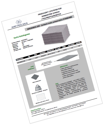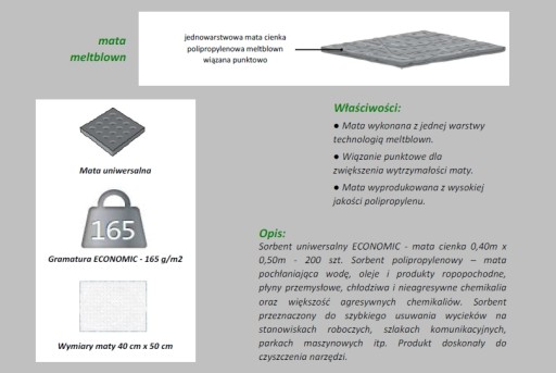 Sorbent uniwersalny - mata cienka ECONOMIC - 0,40m x 0,50m - 25 szt. Sorbent polipropylenowy – mata pochłaniająca wodę, oleje i produkty ropopochodne, płyny przemysłowe, chłodziwa i nieagresywne chemikalia oraz większość agresywnych chemikaliów. Sorbent przeznaczony do szybkiego usuwania wycieków na stanowiskach roboczych, szlakach komunikacyjnych, parkach maszynowych itp. Sorbent w matach to również doskonała alternatywa dla zwykłego czyściwa. Centryczna perforacja umożliwia rozdzielenie maty. Mata wykonana w technologii MeltBlown.