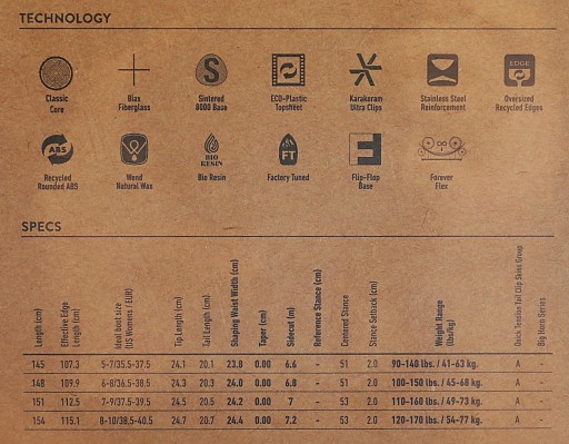 length 151 cm, tip length 24,5 cm, shaping waist width 24,2 cm, tail length 20,5 cm, sidecut 7 m, effective edge length 112,5 cm, weight range 49 –73 kg