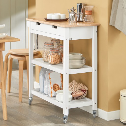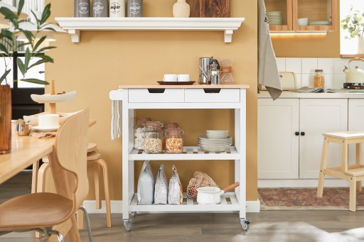 Największą zaletą tego wózka jest jego mobilność. Dzięki małym kółkom może z powodzeniem służyć do serwowania potraw.