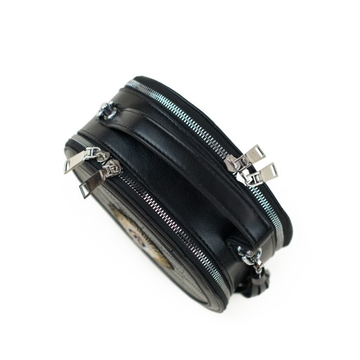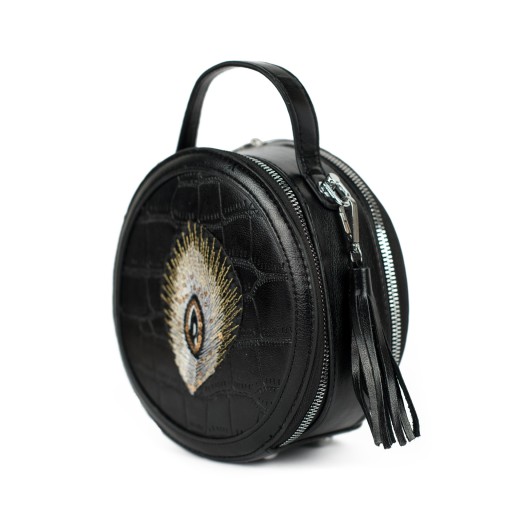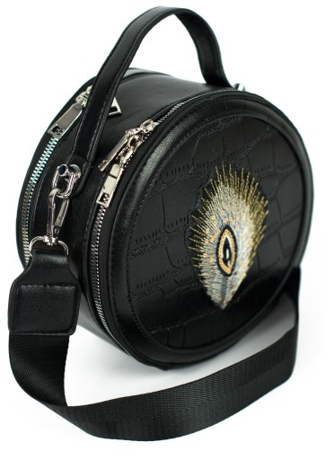 Zdobiona torebka na planie koła, wykonana z eko-skóry.