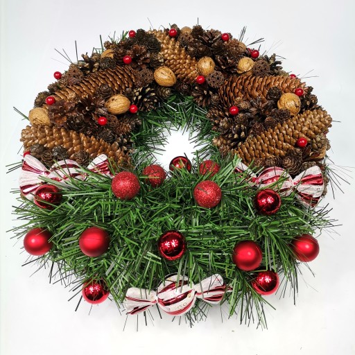 Prezentujemy Państwu w całości własnoręcznie wykonane wianki bożonarodzeniowe w wielu typowo świątecznych kolorach, ozdabiane dużą ilością różnego rodzaju szyszek, naturalnymi dodatkami jak orzechy, cynamon, suszone owoce, zielonymi gałązkami oraz akcesoriami florystycznymi i bombkami.