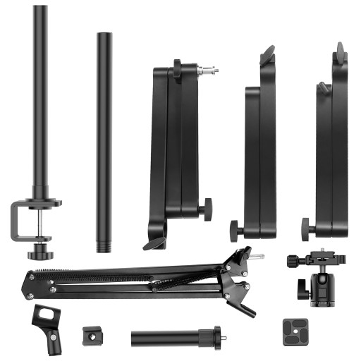 Obrotowe ramiona ułatwiają ustawienie odpowiedniego kąta dla lampy, kamery i mikrofonu. Możesz nawet regulować wysokość uchwytu na aparat.