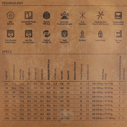 rozmiar 167: zestaw back 20 mm, ciężar osób: 73-95 kg, kontaktowa krawędź: 124,6 cm, szerokość czubka: 30,5 cm, szerokość środka: 25,9 cm, szerokość pięty: 29,2 cm, wycięcie: 9,4 m, średni szerokość postoje: 60 cm