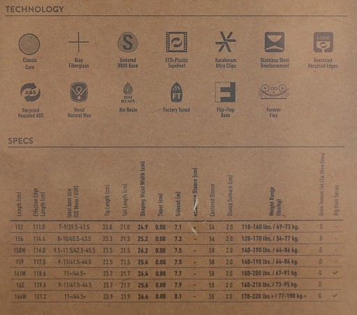 rozmiar 159: ciężar osób: 64-86 kg, efektywna krawędź: 117,0 cm, tip length 23,5 cm, tail length 21,5 cm, shaping waist width 25,4 cm, sidecut 7,5, centered stance 58, stance setback 2,0 cm