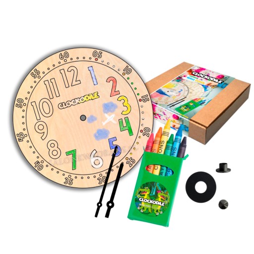 Drewnianą tablicę z narysowanymi wcześniej cyframi możesz pomalować dołączonymi kredkami woskowymi lub innymi kolorami, które masz w domu – akwarelami, flamastrami i temperą. W opakowaniu znajdziesz również części potrzebne do złożenia zegara oraz instrukcję uruchomienia zegara.