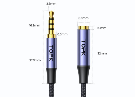 Kabel mini jack 3,5mm - mini jack 3,5mm Topk jest wysokiej jakości, elastycznym kablem, idealnym do zastosowania w sprzęcie hi-fi, smartfonach, komputerach, itd. Posiada złącza pokryte 24-karatowym złotem dla optymalnej zdolności przewodzenia i odporności na matowienie i korozję.
