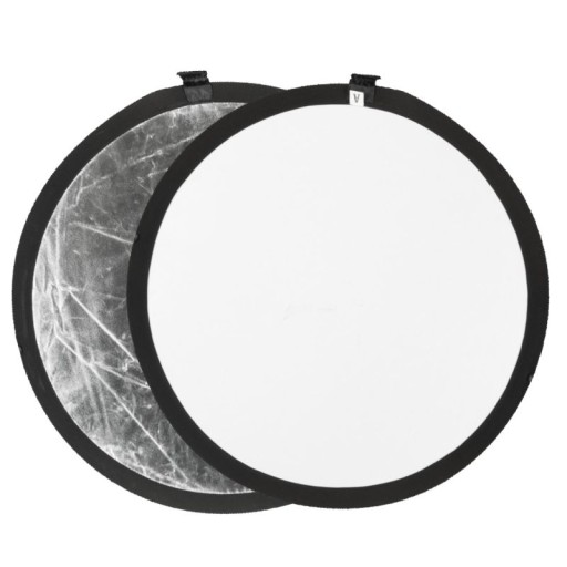Okrągła blenda biało-srebrna to produkt przydatny i w studio i w plenerze. Pozwala na odbijanie światła lampy lub słońca i doświetlanie zacienionych miejsc. Wyposażona jest w dwa ekrany biały i srebrny, z których każdy zapewnia inną jakość odbitego światła.