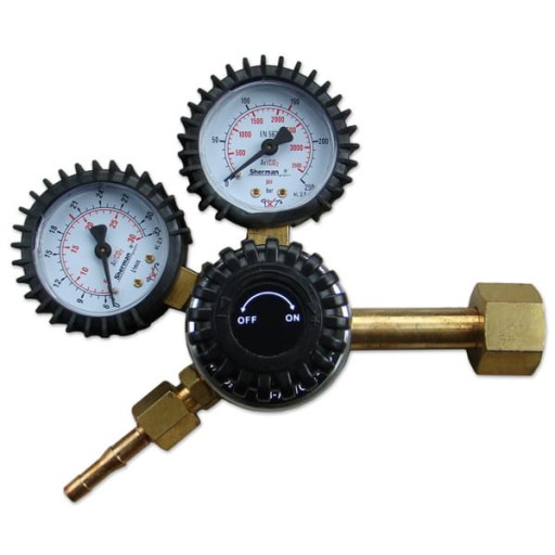 Jednostopniowy reduktor butlowy ciśnienia wylotowego. Rodzaj gazu: Argon/Co2, znamionowe ciśnienie wlotowe: 200 bar, przepustowość: 20 l/min. Producent: Sherman.