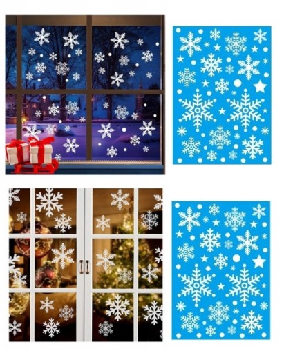 Śnieżynki doskonale prezentują się na szybach, w oknach i witrynach. Można je również nakleić na dowolny gładki przedmiot - naklejki mogą zdobić płaskie i gładkie powierzchnie takie jak szyby, meble, samochody, urządzenia itp.