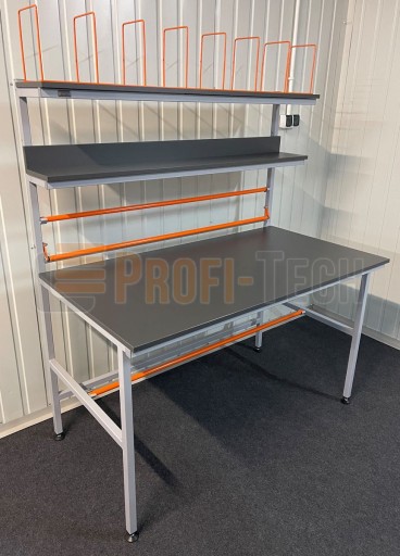 uchwyt na monitor, uchwyt na drukarkę do etykiet, uchwyt do worków na odpady, półki boczne, moduł oświetlenia, moduł cięcia folii, zmiana materiału blatu roboczego.