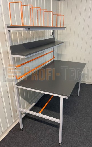Stoły i stojaki wykonane są z profili stalowych, które zostały trwale zabezpieczone za pomocą lakierowania proszkowego, krawędzie profili wypełnione są zatyczkami PVC.