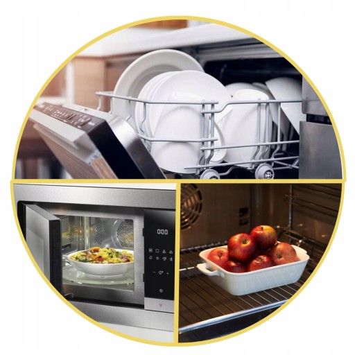 Produkty są wykonane z wytrzymałej porcelany, dzięki czemu można je nawet umieścić w piekarniku w temperaturze do 240C