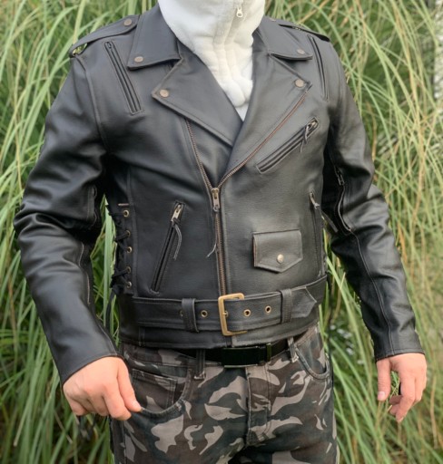 Ramoneska motocyklowa z wytłoczonym orłem i logo PL, wykonana ze skóry bydlęcej.