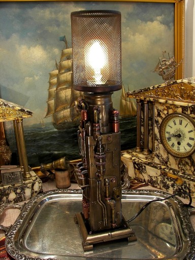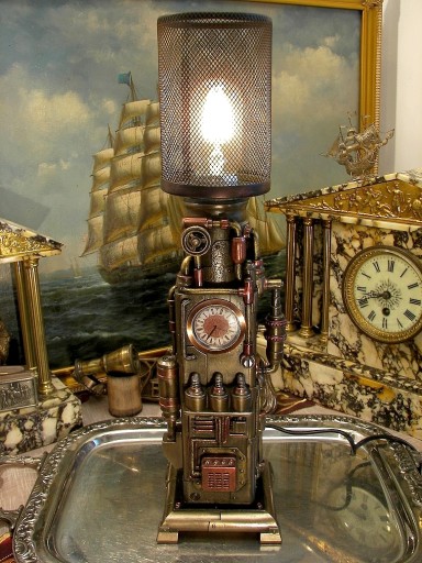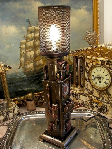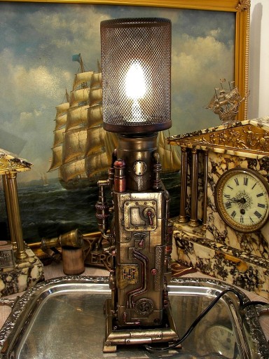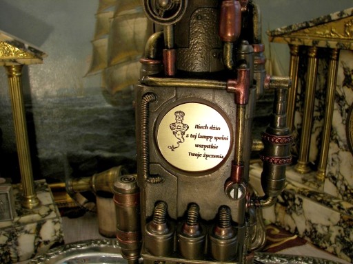 Zapraszam do zakupu niezwykłej lampy z zegarkiem w stylu steampunk. Lampa przypomina jakąś niezwykłą, parową maszynę z XIX wieku, której jedynym celem jest zasilanie zegara i lampy. Przenosi nas w czasie do okresu niezwykłych wynalazków, literatury fantastycznej Juliusza Verna. Fantastycznie się prezentuje do tego jest nie tylko nietuzinkowym gadżetem, ale daje nastrojowe światło i wskazuje czas. Przedmiot jest precyzyjnie wykonany z poliresinu, pokryty brązem, ręcznie malowany.