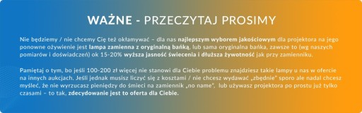 Pamiętaj o tym, bo jeśli 100-200 zł więcej nie stanowi dla Ciebie problemu znajdziesz takie lampy u nas w ofercie. Jeśli jednak musisz liczyć się z kosztami / nie chcesz wydawać "zbędnie" sporo, ale nadal chcesz myśleć, że nie wyrzucasz pieniędzy do śmieci na zamiennik "no name", lub używasz projektora po prostu już tylko czasami - to tak, zdecydowanie jest to oferta dla Ciebie.