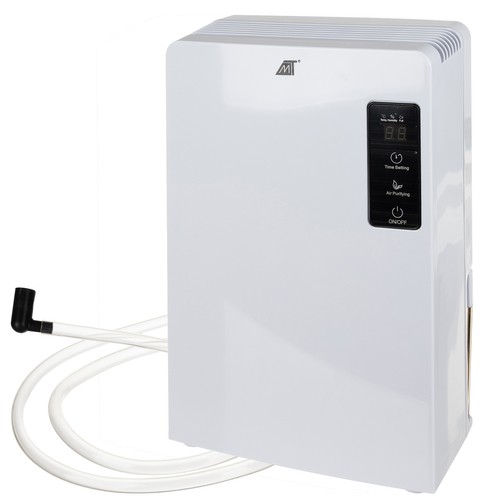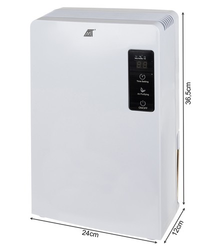 - SPECYFIKACJA - kolor: biały; materiał: metal / tworzywo sztuczne; wyświetlacz: LCD, pokazuje: temperaturę i wilgotność; timer: 24 - godzinny; 2w1 oczyszczanie i osuszanie powietrza; możliwość pracy w temperaturze poniżej 0: tak do -5ºC; funkcja automatycznego odszraniana; wielkość pomieszczenia: do 30m²; oczyszczanie: do rozkładu zanieczyszczeń z powietrza wykorzystuje technologię oczyszczania światłem UV i dwutlenkiem tytanu (TiO2); wydajność osuszania: do 700 ml na dzień przy 25ºC i 85% wilgotności; pojemność zbiornika na wodę: 2200ml; możliwość odprowadzenia wody przez wężyk: tak; napięcie: 220-240V; moc: 65W; automatyczne wyłączanie po napełnieniu zbiornika: tak; tryb pracy: w o parciu o system Peltiera; odpowiedni do: domu, biura itp; wyjmowany zbiornik na wodę; wymiary: 36,5/12/24cm; długość wężyka: 100cm; długość kabla: 1,30m; waga: 2,382kg; waga w opakowaniu: 2,781kg.