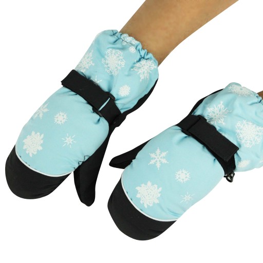 Piękne, ciepłe, jednopalczaste rękawiczki dziecięce w kolorze niebieskim, z motywem delikatnych płatków śniegu. Od wewnątrz wypełnione poliestrową ociepliną. Od spodu rękawiczek warstwa gumowa ułatwiająca chwytanie. Posiadają gumkę, dzięki której można je swobodnie zaciągnąć na odzież wierzchnią. Rękawiczki można spiąć razem.