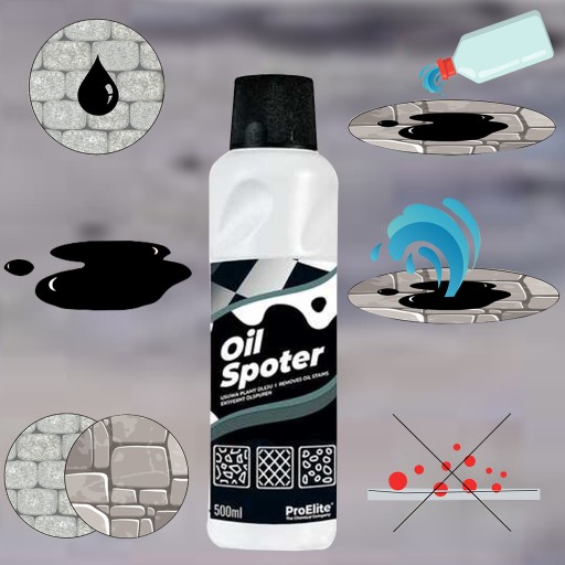 Oil Spoter to środek do usuwania oleju z kostki brukowej, kamienia oraz innych powierzchni o porowatej strukturze. Dokładnie usuwa wszystkie tłuste plamy z oleju samochodowego, czy środków ropopochodnych. Unikalna receptura sprawia, że nie wymaga stosowania wody, czy myjek ciśnieniowych.
