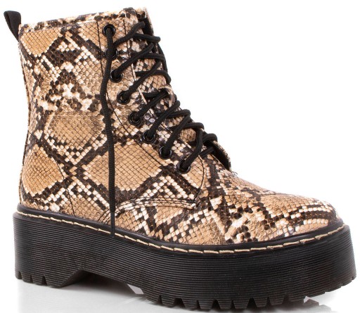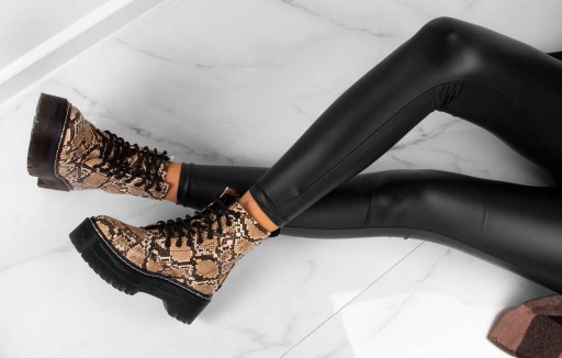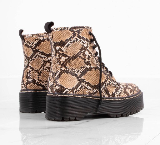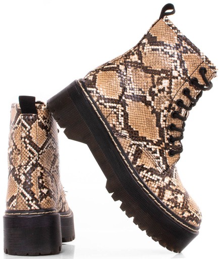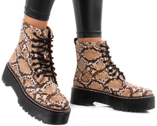 Stylowe workery wykonane ze skóry ekologicznej z motywem wężowym. Model z delikatnym ociepleniem . Botki są na wygodnej platformie, sznurowane.
