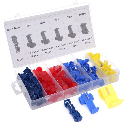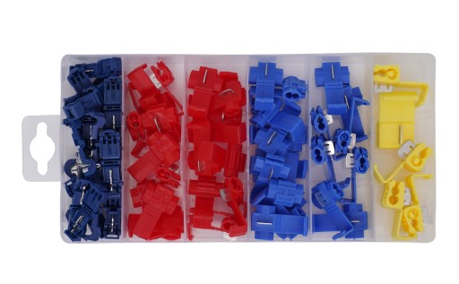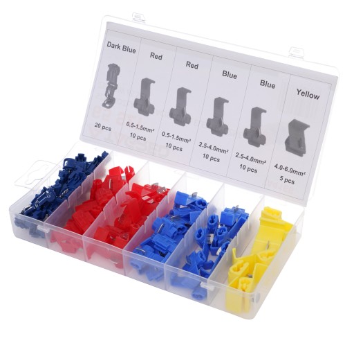 Zestaw kolorowych złączek elektrycznych, które służą do bezproblemowego - szybkiego łączenia przewodów elektrycznych bez używania specjalistycznych narzędzi. Wystarczy włożyć końcówki zarobionych kabli do szybkozłączki i zacisnąć ją plastikowym klipsem. Szybkozłączki pasują do najbardziej popularnych średnic przewodów elektrycznych. Zestaw zawiera 65 elementów, a całość umieszczono w wygodnym sortowniku.