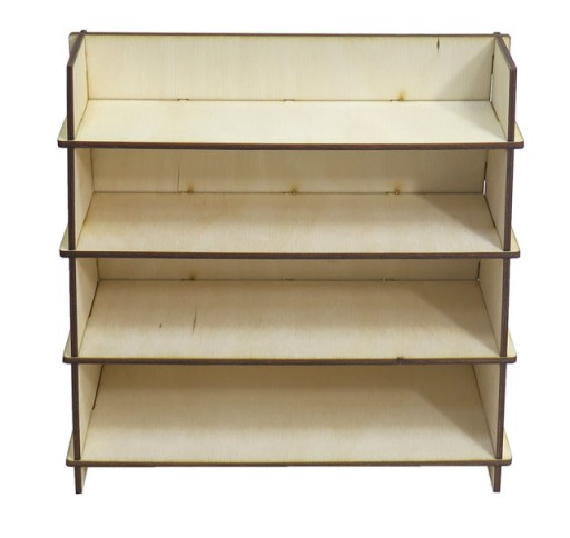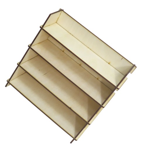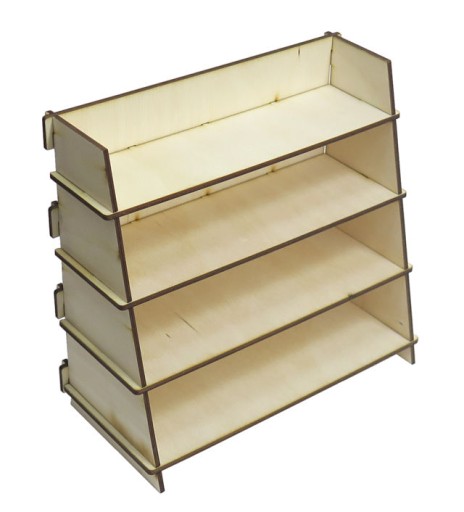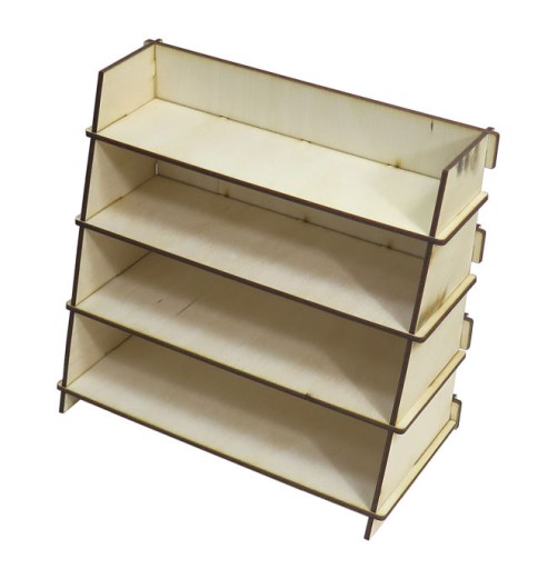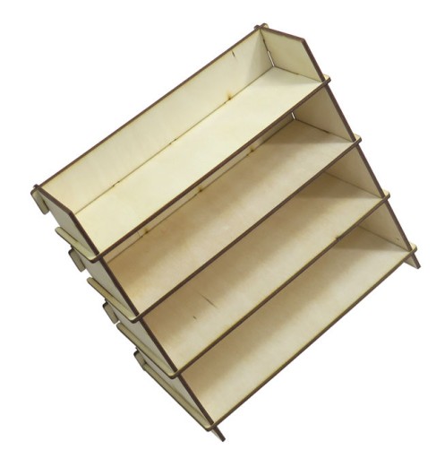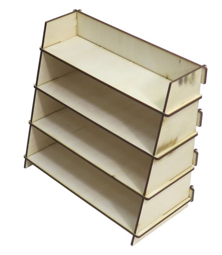 - Stojak o wymiarach po złożeniu: wysokość: 200mm, szerokość całkowita: 216mm, głębokość poszczególnych półek: 58mm, 71mm, 83mm, 96mm.