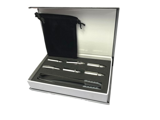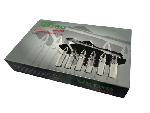 Aukcja dotyczy zestawu 6 kostek lodowych w kształcie pocisku + szczypce oraz etui