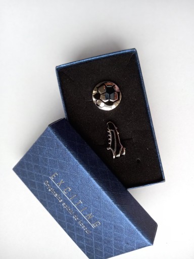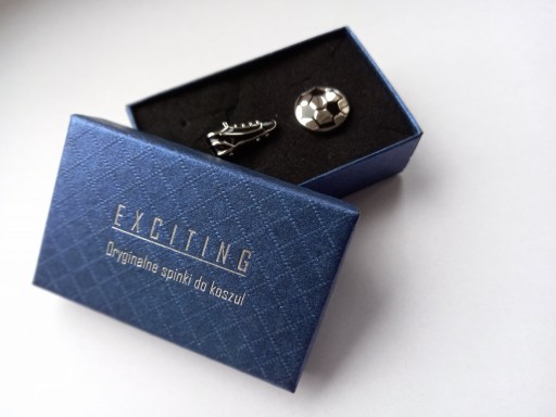 Zestaw spinek do mankietów koszuli marki Exciting. Spinki zostały wykonane z metalu szlachetnego. Zestaw dwóch spinek jest zapakowany w czarne lub niebieskie kartonowe pudełko. Do wyboru zestaw dwóch piłek lub piłka i korkotrampek. Za dopłatą możemy zapakować spinki w ekskluzywne etui z wzorem skóry węża pokazane na dalszych zdjęciach.