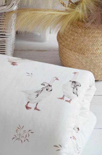 W skład kompletu wchodzi kocyk z wypełnieniem o grubości ok. 3cm, oraz płaska podusia. Idealny do wózka podczas spacerów oraz do łóżeczka jako ciepła kołderka. Może służyć również jako miękka mata do zabawy.