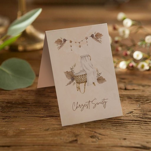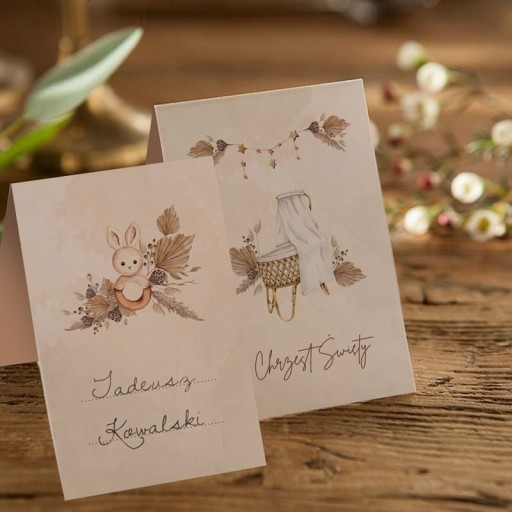 - skład: 10szt winietek na Chrzest wykonanych z grubego papieru, dekorowanych dwustronnym motywem: posiadają grafiki akwareli oraz kołyski w stylu boho oraz miejsca na uzupełnienie nazwisk gości; od wewnątrz winietki mają piękny brązowy odcień