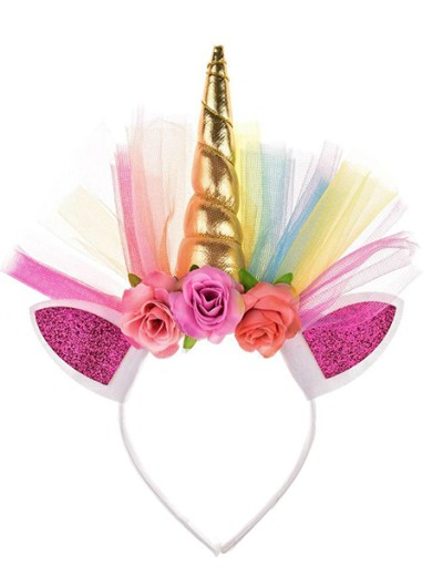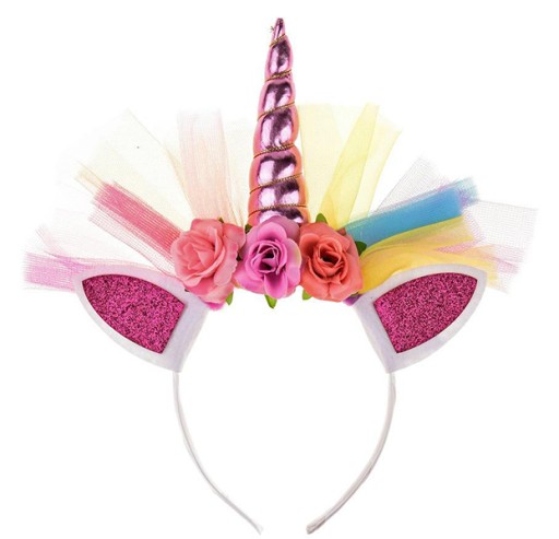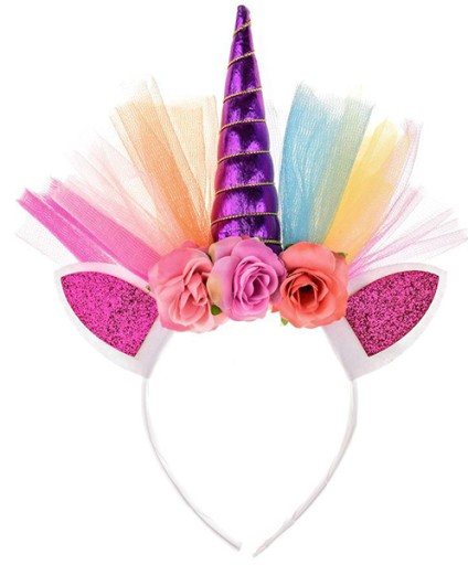 - opaska na głowę z uszkami i rogiem jednorożca oraz kolorowym tiulem i kwiatuszkami (kolory kwiatuszków i roga pegaza różne w zależności od dostawy)