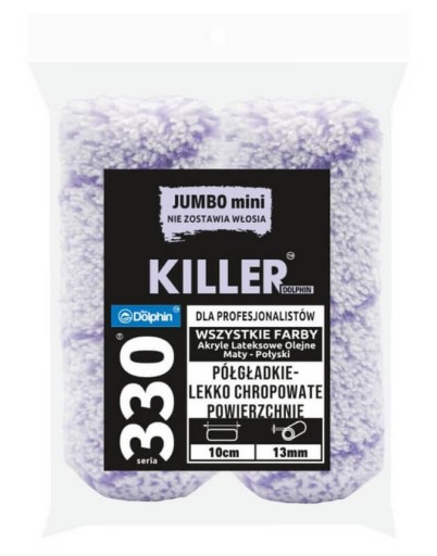 Blue Dolphin Wałek malarski KILLER Jumbo Mini serii 330 to wałek malarski wykonany z innowacyjnego materiału MICROFIBER BLEND, który lepiej chłonie i oddaje farbę, a przy tym nie zostawia włosia. Jego zaletą jest też nieskomplikowane mocowanie. Nawet przy wielokrotnym użyciu zachowuje swoją pierwotną puszystość.