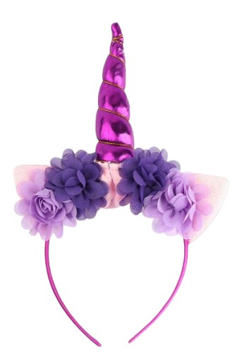 - opaska na głowę z brokatowymi uszkami i rogiem jednorożca oraz kwiatuszkami