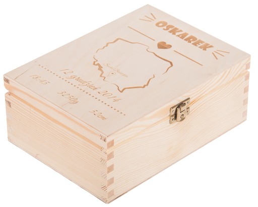 Wychodząc naprzeciw Państwa oczekiwaniom stworzyliśmy eleganckie, drewniane, ręcznie wykonane pudełko wspomnień w które można uchwycić te wspomnienia i chwile z dzieciństwa. Pierwszy smoczek, zdjęcia USG, metryczka ze szpitala, a może pudełko wróżki-zębuszki. Naszym kuferkiem mogą Państwo zastąpić nudne plastikowe lub tekturowe opakowania. Szkatułka z Państwa indywidualną dedykacją i życzeniami będzie stanowić niezapomnianą pamiątkę na długie lata.