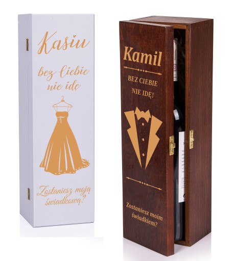 Wychodząc naprzeciw Państwa oczekiwaniom stworzyliśmy eleganckie, drewniane, ręcznie wykonane pudełka. Idealny pomysł na poproszenie swoich przyszłych świadków o pełnienie tej odpowiedzialnej funkcji podczas uroczystości zaślubin. Z pewnością zaskoczy obdarowane osoby. Naszym kuferkiem mogą Państwo zastąpić nudne plastikowe lub tekturowe opakowania. Szkatułka z Państwa indywidualną dedykacją i życzeniami będzie stanowić niezapomnianą pamiątkę na długie lata.