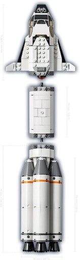 Duża rakieta z kilkoma członami ma otwierany kokpit dla dwóch minifigurek i ładownię, w której można schować łazik. Duży transporter rakiety ma otwieraną kabinę, gąsienice, ruchome podpory i wyrzutnię. Ciężarówka do transportu łazika wyposażona jest w przegubowy chwytak (nowość na czerwiec 2019 r.) i płaską platformę, a sam łazik w wysuwany chwytak i wiertło.