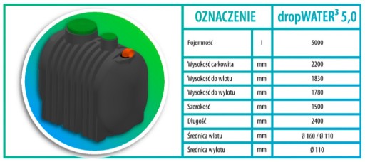 Podziemny bezciśnieniowy zbiornik dropWATER³, który przeszedł pozytywna weryfikację w Instytucie Techniki Budowlanej, może zostać wykorzystany do magazynowania wody deszczowej lub do magazynowania ścieków pochodzących z gospodarstwa domowego. Typoszereg zbiorników dropWATER³, aby zapewnić swobodny dobór produktu, składa się, z pięciu zbiorników o pojemności od 2,0 m³ do 6,0 m³. Każdy ze zbiorników wyposażony jest w otwór rewizyjny oraz właz montażowy, zabezpieczone przed nieupoważnionym dostępem osób trzecich, przy pomocy przykręcanej pokrywy. Do każdego zbiornika, dopływ wody deszczowej lub ścieków może odbywać się przy pomocy rury kanalizacyjnej o średnicy Ø110 lub Ø160 mm. Specjalnie wyprofilowane dno umożliwia montaż zbiorników na terenach z możliwością występowania wysokich wód gruntowych.