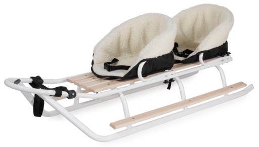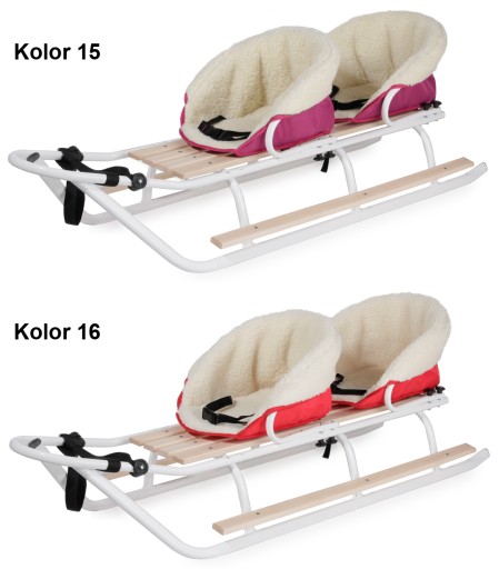 Przedmiotem sprzedaży są lekkie sanki Duo polskiego producenta, przeznaczone dla bliźniąt, rodzeństwa oraz rodzica z dzieckiem. Sanki produkowane są ze stali o grubym profilu. Mocne spawy to gwarancja wytrzymałej i stabilnej konstrukcji. Płozy o szerokim rozstawie zwiększają bezpieczeństwo jazdy naszych pociech. Wyposażone są w pchacz z regulacją i gumowym naciągiem oraz dwa oparcia z możliwością przekładania.Pchacz i oparcie można w łatwy i szybki sposób zdemontować w zależności od potrzeb. Sanki wyposażone są w podnóżek, który zwiększ komfort jazdy starszych dzieci.Posiadają dwa cieplutkie siedziska wykonane z wysokiej jakości wełny owczej, wyposażone w pasy bezpieczeństwa. Dodatkowe ocieplenie siedzisk stanowi mięciutka gąbka tapicerska. Wełniane siedziska nakładane są na oparcia, a od spodu zapinane za pomocą paska i klamerki co stanowi zabezpieczenie przez zsuwaniem się z sanek.
