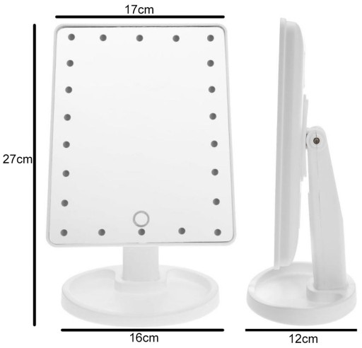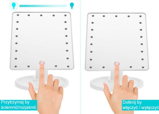 - 22 DIODY LED – lusterko posiada 22 diody LED, które usytułowane są na jego brzegach. Takie ustawienie diod pozwala na bardzo dobre oświetlenie każdej części twarzy, dekoltu czy szyi. Intensywność oświetlenia można regulować za pomocą dotykowego przycisku, który znajduje się na dole lusterka.