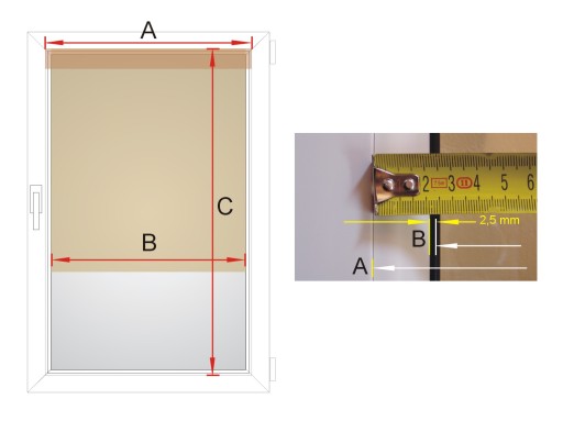 B: szerokość materiału czyli szerokość między listwami minus 0,5 cm (inaczej pisząc, jest to szerokość szyby plus gumowe uszczelki minus 0,5 cm aby materiał się nie kleszczył, różnica pomiędzy szerokościami powinna wyjść ok 4 cm, tej szerokości będzie materiał)