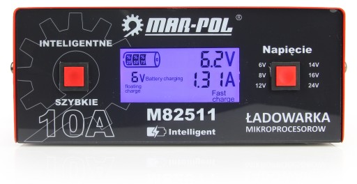 Prostownik mikroprocesorowy marki MAR-POL to prostownik z mikroprocesorowym systemem kontroli i sterowania w technologii PWM (Pulse-Width Modulation) z możliwością ładowania akumulatorów 6V, 8V, 12V, 14V, 16V i 24V