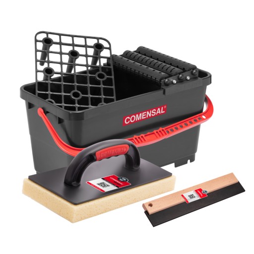Zestaw glazurniczy COMENSAL z wysokiej jakości 24 litrowym wiadrem wyposażonym w trzy perforowane rolki oraz kratkę do odciskania nadmiaru wody i łatwiejszego płukania pacy. Paca glazurnicza z gąbką HYDROchłonną, ciętą i dużą gumową szpachelkę (fugówkę)