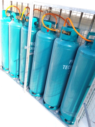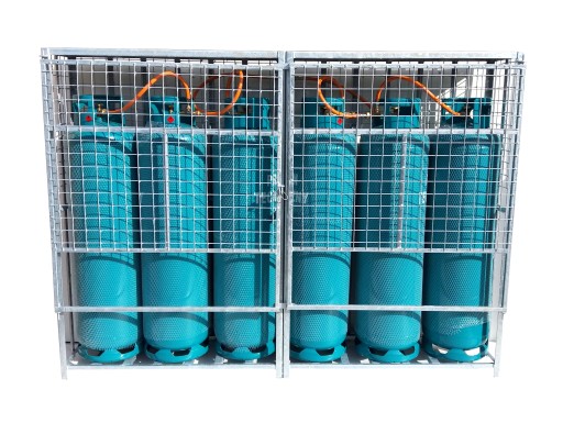 KONTENER STALOWY OSIATKOWANY DO MAGAZYNOWANIA 6 BUTLI 33 KG W RZĘDZIE WRAZ ZESTAWEM POD INSTALACJE GAZOWĄ NA 6 BUTLI WRAZ Z 6 PUSTYMI BUTLAMI 33KG