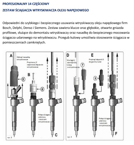 Pozwala na łatwy i szybki demontaż zapieczonych wtryskiwaczy z głowicy silnika. Zestaw zawiera niezbędne klucze używane wraz z adapterami.