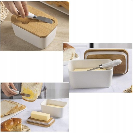 Elegancka, ceramiczna maselniczka z bambusową pokrywką i nożykiem.