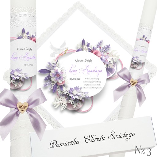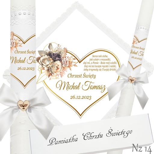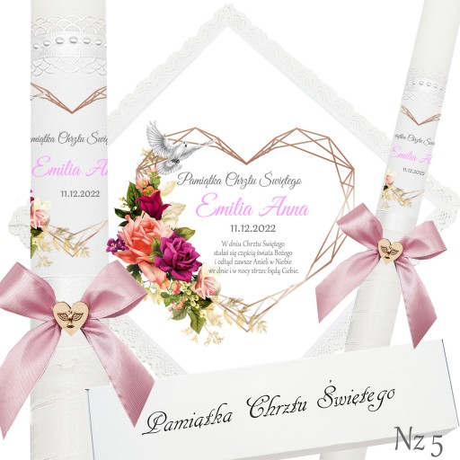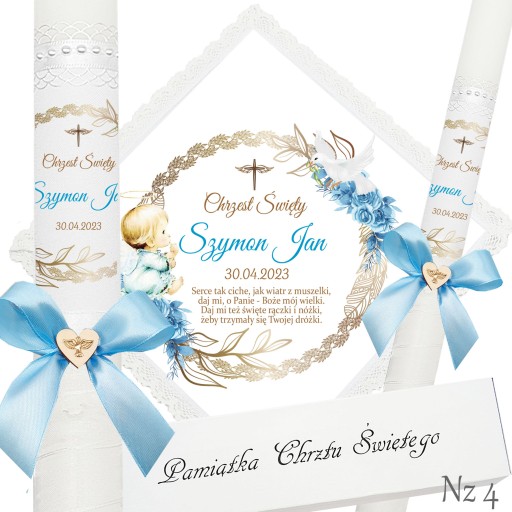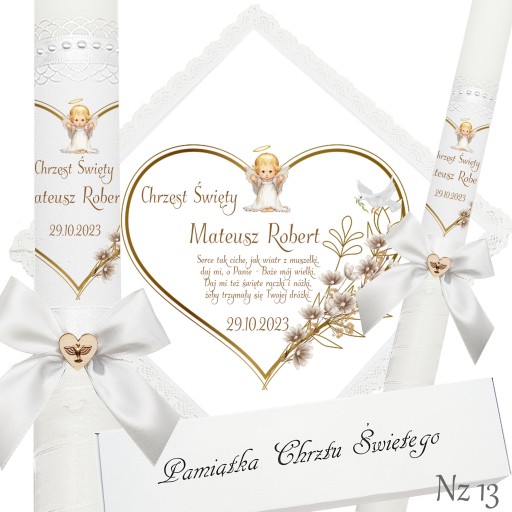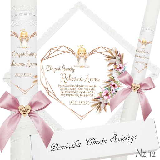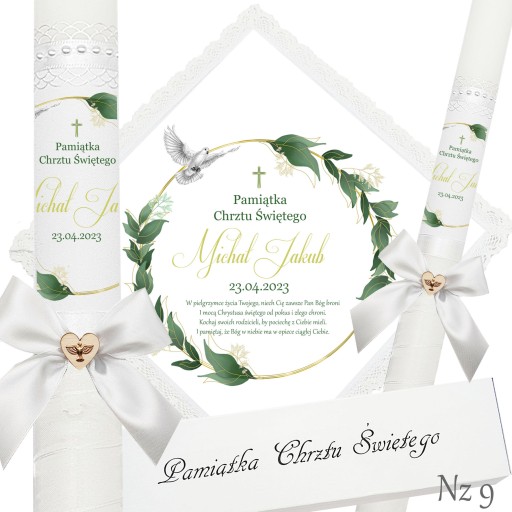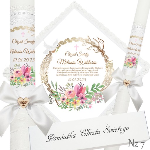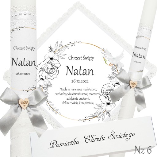 Prezentujemy niezwykły komplet do chrztu składający się ze szatki i świecy, to idealny wybór dla rodziców, którzy chcą uczcić ten szczególny dzień w elegancki i niezapomniany sposób. Świeca została ozdobiona wstążką szyfonową w kolorze białym, co dodaje jej wyjątkowego charakteru i uroku. Góra świecy została udekorowana koronką atłasową i białymi perełkami, co nadaje jej elegancji i szyku. Kokarda z drewnianym serduszkiem i metalowym złotym emblematem Ducha Św. dodaje uroczego i sentymentalnego akcentu. Wszystko zostało zapakowane w ozdobne pudełko, co pozwala na przechowywanie tych niezwykłych pamiątek.