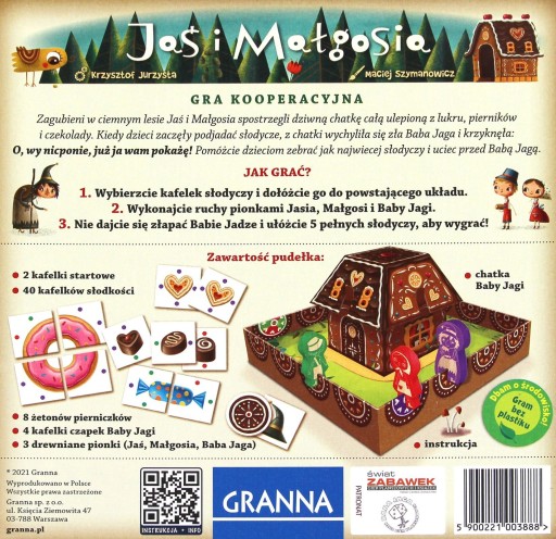 - 3 drewniane pionki (Jaś, Małgosia, Baba Jaga)