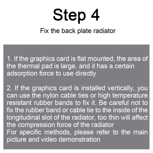 1.Jeśli karta graficzna jest montowana na płasko, podkładka termiczna ma duży rozmiar i ma pewną siłę docisku, dzięki czemu można tak zostawić lecz wskazane jest korzystanie z opasek i try-tytek.